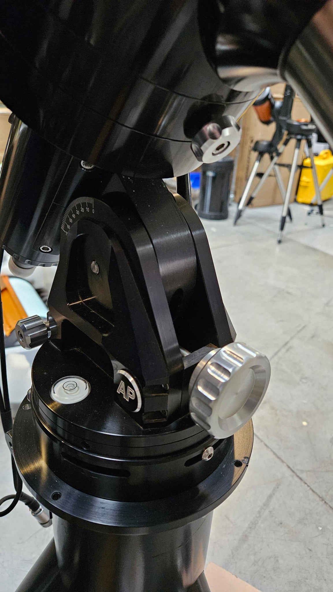The azimuth adjuster knobs are now at the rear of the R.A. axis, which provides easier access and nearly doubles the precision of their adjustments. An etched line on the adjuster housing corresponds with the ridges of the knobs to provide a measured adjustment of 0.7021 degrees (42 arcminutes) per rotation or 0.05 degrees (3 arcminutes) per ridge.